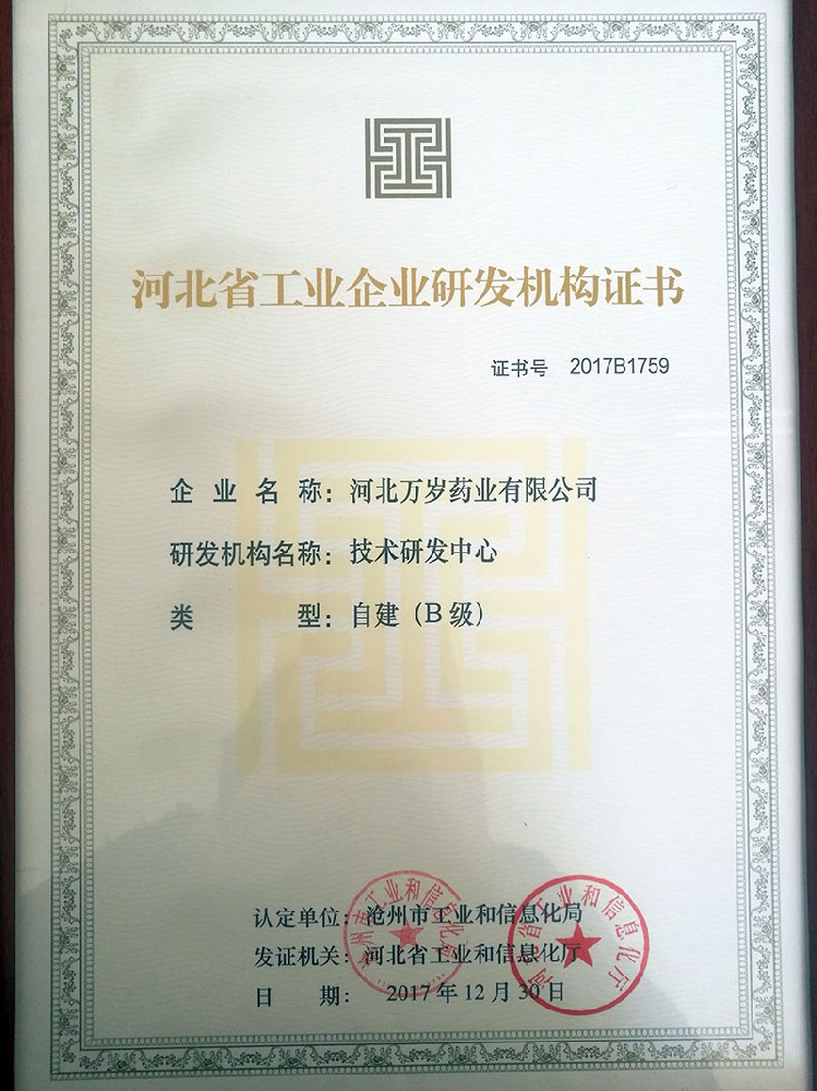 河北省工業企業研發機構證書
